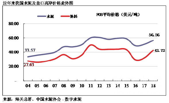 自2006年水泥出口達(dá)到高峰的3,612萬噸以后,我國水泥出口量呈明顯逐年下降趨勢,主要原因:一是我國出口政策的調(diào)整,2007年國家取消了11%出口退稅的優(yōu)惠政策。二是國際市場需求疲軟,水泥需求缺口縮小,尤其是原來我國出口大戶美國房地產(chǎn)業(yè)投資大幅下滑,導(dǎo)致其進(jìn)口水泥大幅度縮減。2018年出口量僅為904萬噸,這是自2005年以來首次跌破1000萬噸,但出口的FOB價(jià)格連續(xù)三年回升,2018年達(dá)到56.6美金。
